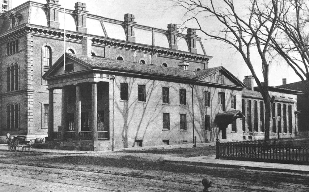 Bassett oversaw two major building projects. The first, in 1883, involved the construction of an addition to the back of the library to make room for more books and to enlarge the reading rooms. The second, more ambitious project, was the construction of an entirely new building on Grand Street in 1894. The new library, designed in the Italian Renaissance Revival style, consisted of two sections: a palazzo-style main building with reading rooms and offices, and a more utilitarian rear building for the book stacks, which was able to hold up to 220,000 volumes.